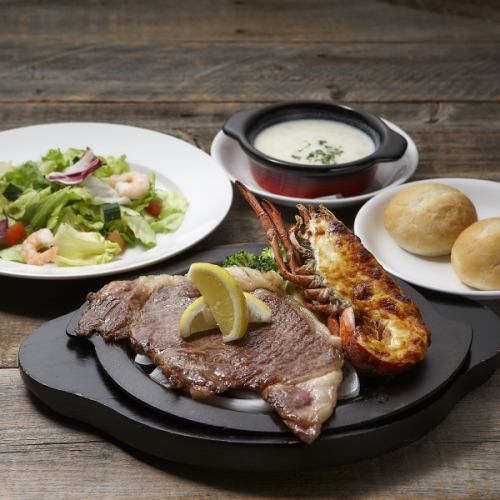人気メニューのロブスター&ステーキを楽しめるセットです。 ・サラダ ・クラムチャウダー ・メイン【ロブスターテールの黄金焼き】 ・メインの組み合わせを以下からお選びください【ローストビーフwithガーリックライス】or【チキンミラネーズ&ライスorパン】